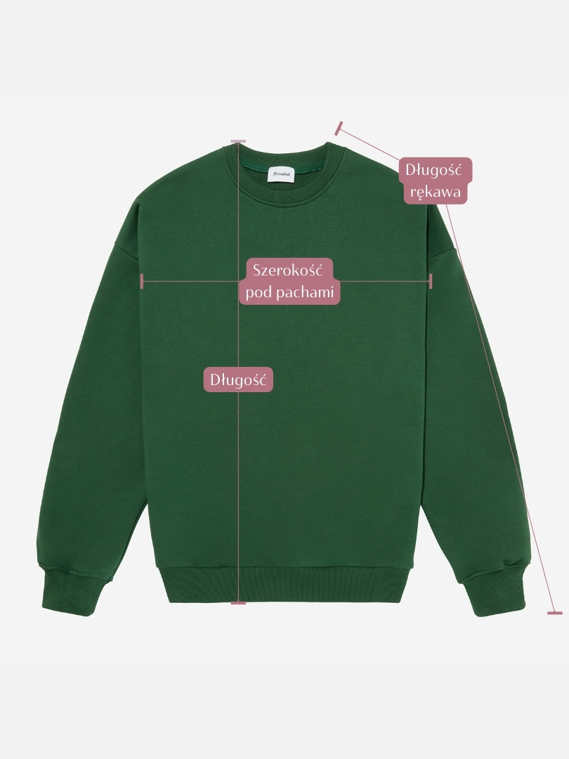 Bluza unisex o kroju oversize w kolorze greener pastures, nadruk na klatce piersiowej w kolorze białym. Produkt jest wykonany z dzianiny pętelkowej ze splotem diagonalnym o gramaturze 420 g/m2.