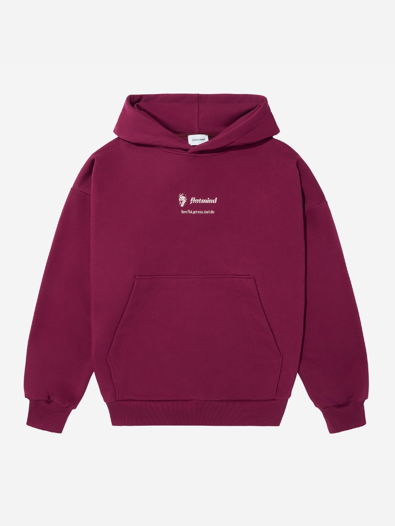 Bluza unisex z kapturem o kroju oversize w kolorze red plum, nadruk na klatce piersiowej w kolorze białym. Produkt jest wykonany z dzianiny pętelkowej ze splotem diagonalnym o gramaturze 420 g/m2. Skład dzianiny to 90% bawełna, 10% poliester dla wzmocnienia materiału oraz stabilności kurczliwości.